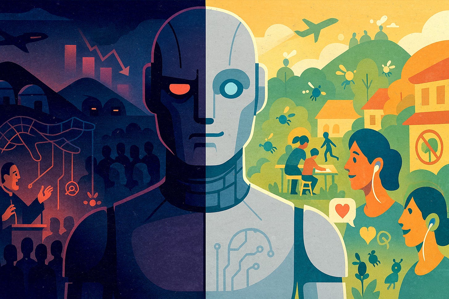 Do you think AI will usher in dystopia or utopia or none of the above? If you’re not sure, we’re here to help! Just look at the three pairs of alternative futures below and, in each case, tell us which of the two scenarios you consider more likely—or, if you find both alternatives vanishingly unlikely, so indicate. In the next Earthling we’ll report on the survey results, and that will give you a sense for where on the spectrum of NZN reader opinion you belong.