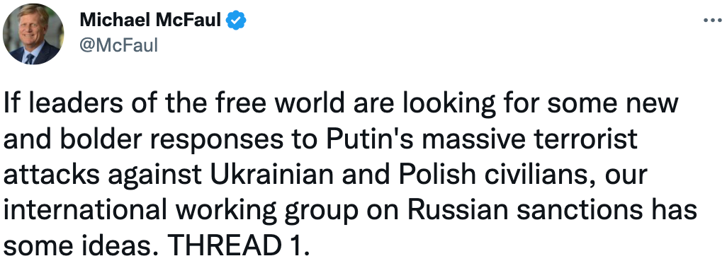 The “new and bolder responses” included designating Russia a state sponsor of terrorism, seizing some of its assets, and imposing a bunch of new sanctions. Shortly after McFaul’s tweet, US and Polish officials said the explosion likely resulted from an errant Ukrainian missile.