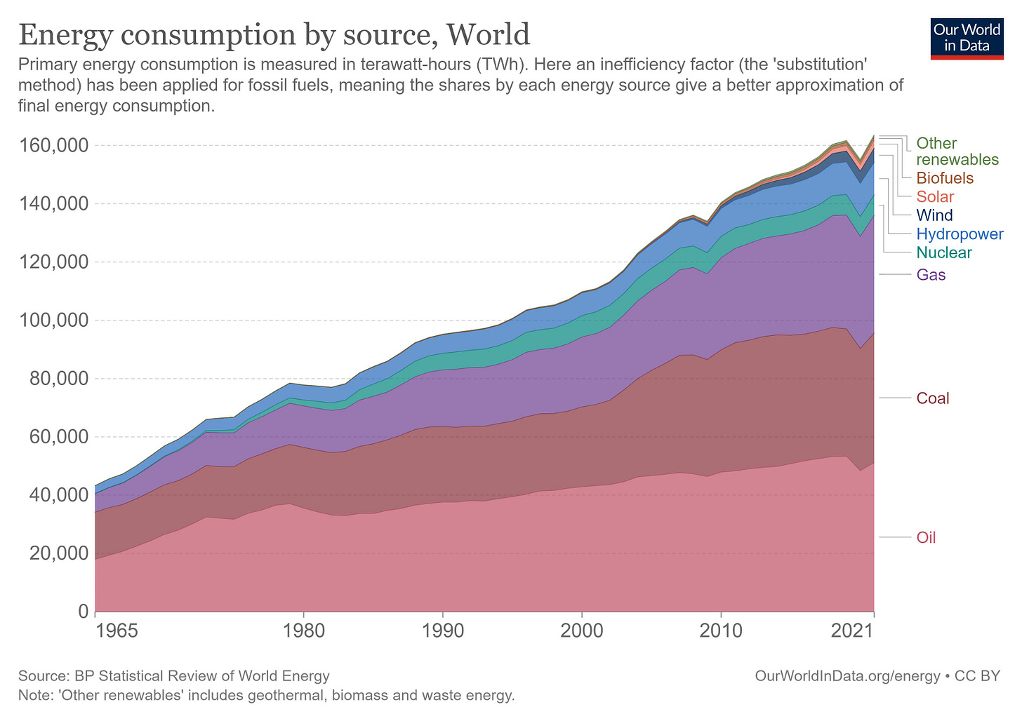 This week on Twitter, entrepreneur Arnaud Bertrand applied this distinction between relative and absolute decline to fossil fuels writ large, and showed why current trends aren’t cause for rampant optimism. Though fossil fuels today constitute a smaller percentage of consumed energy resources than they did thirty years ago, consumption of fossil fuels has increased by 64 percent.
