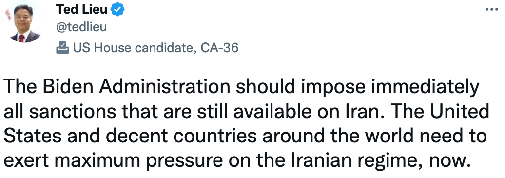 Meanwhile, House Representative Ted Lieu was giving McFaul a run for his money. After Newsweek reported that Iran had sentenced 15,000 jailed protesters to death (an obviously dubious claim that Newsweek has now retracted), Lieu did some draconian sentencing of his own.