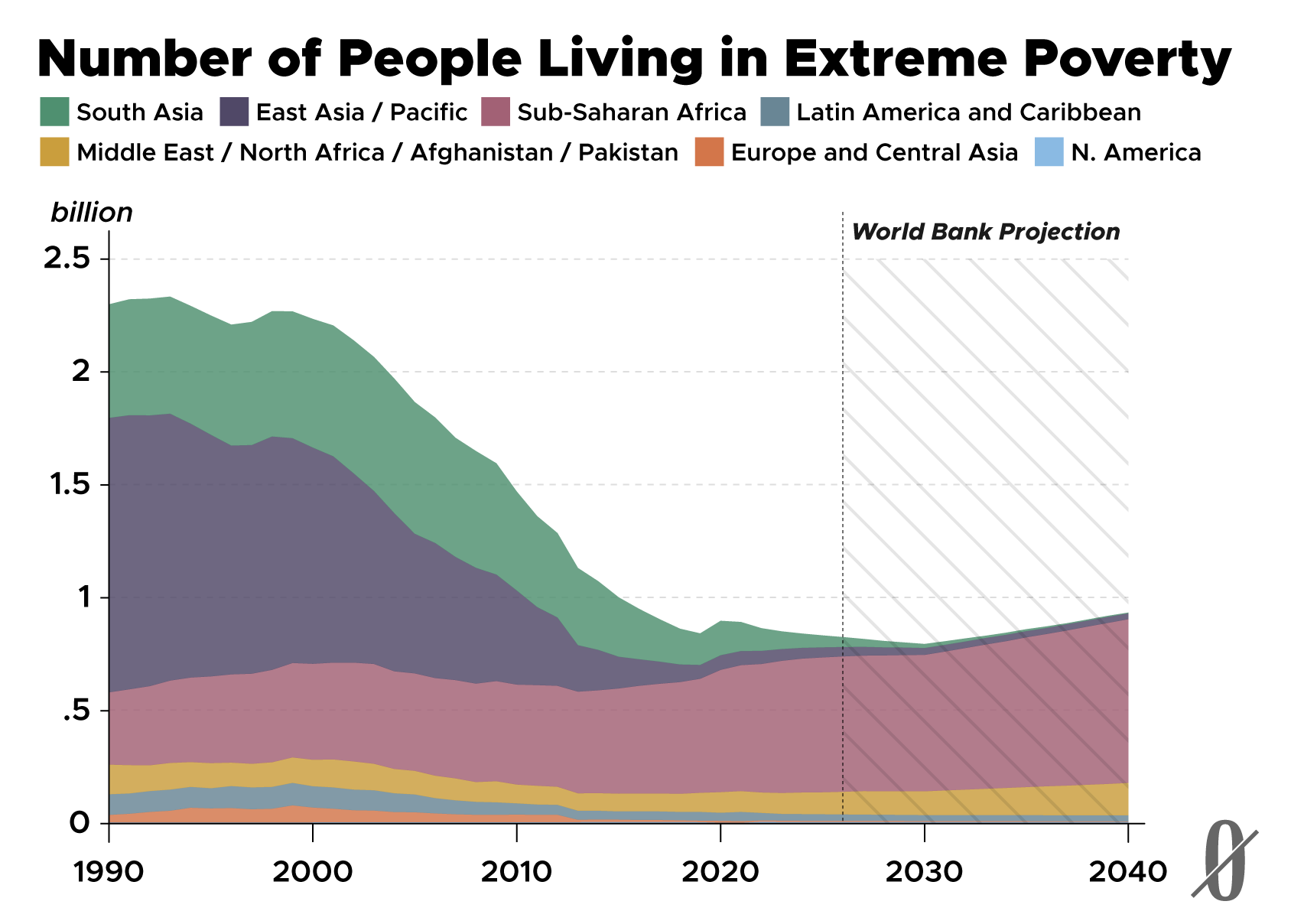 In Our World in Data, Max Roser argues that the sharp reduction in poverty seen in recent decades is unlikely to continue. The countries that have seen rapid declines in poverty by and large can’t continue to see them because the poverty rates have gotten so low. And for most countries with high poverty rates, there aren’t a lot of obvious causes for optimism. “Today, the majority of the world’s poorest people are living in economies that have not achieved economic growth in the recent past.”