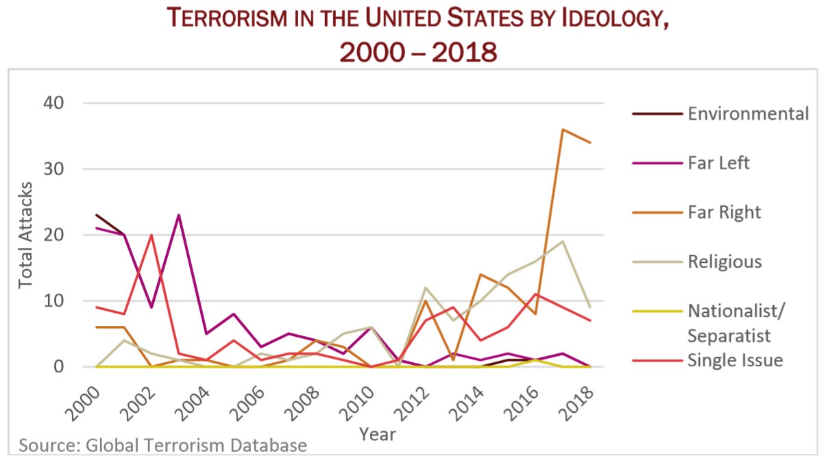 After 9/11, an enduring upsurge in terrorist attacks against America was widely anticipated. And sure enough, the University of Maryland’s annual terrorism report, released this week, shows that the number of terrorist attacks in America last year was the highest since 1982. But here’s what wasn’t anticipated after 9/11: the big problem isn’t radical Islamism. All six lethal terrorists attacks in the US, featured “far-right ideological elements including primarily white supremacy and in at least two cases, male supremacy,” the report notes. The good news: terrorist attacks worldwide are down, and in the US the number of lethal attacks dropped in 2018 (from 18 to 6) as did the total number of deaths due to terrorism (43 in 2018, about half as many as in 2017). Upshot: the chances that you’ll die in a terrorist attack remain roughly zero.