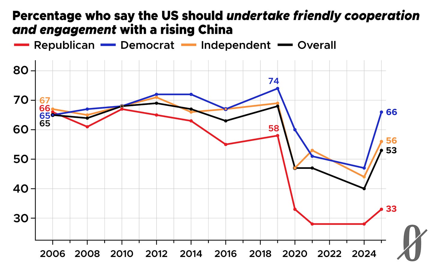 Here’s my guess about the meaning of this graph: (1) Amid the Covid pandemic, American sentiment toward China took a negative turn on a bipartisan basis; (2) With Trump having demonized China near the end of his first term, sentiment stayed negative among Republicans during the Biden administration; (3) With the Biden administration demonizing China—part of its Manichaean democracy-vs.-autocracy foreign policy frame—sentiment stayed pretty negative among Democrats; (4) After Trump started his second term with a tariff war against China, Republican sentiment stayed pretty negative but Democratic sentiment (in an example of ‘negative partisanship’) got significantly more positive. The latest signs are that Trump may seek rapprochement with China. If so, it will be interesting to see if Democrats cool on China while Republicans warm to it.