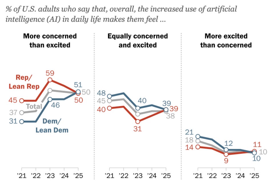 This issue won’t be a problem only for Republicans. Democratic candidates too, have their Silicon Valley donors. And, at the grassroots level, both parties seem divided in their overall reaction to AI, as this Pew Research poll conducted in June illustrates: