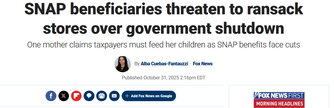 In defense of Fox News reporter Alba Cuebas-Fantauzzi: It’s not really accurate to say that she fabricated her story about outrageous things SNAP recipients were supposedly saying in response to the prospect that the government shutdown would cost them their food subsidies. It’s just that her story was based on fabrications. She assumed that AI-generated deepfake videos circulating on social media weren’t AI-generated deepfake videos. But they were, and Fox News had to retract the story.