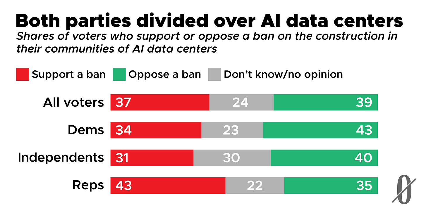 Of course, data centers represent only one aspect of AI’s impact. And for various reasons there is no doubt a difference between the average Republican and Democratic voter’s experience with the costs and benefits of a nearby data center. Still, data centers have become a kind of symbol of rapid AI development. And even if they hadn’t, the phrasing of this survey question—about “data centers that support AI”—would make it, for some respondents, a barometer of sentiment toward AI generally.