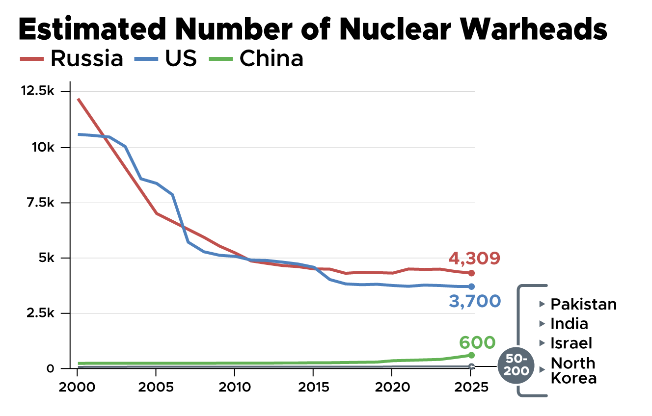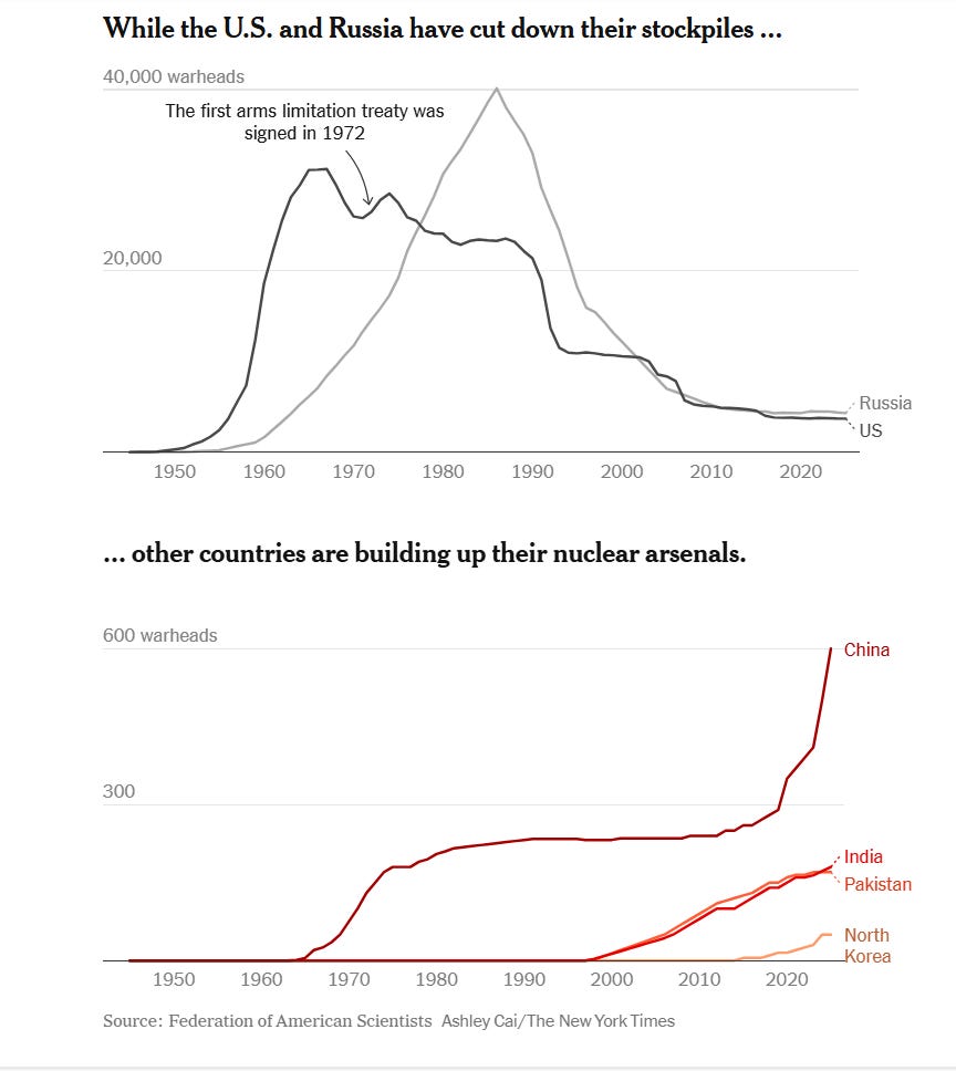 At a quick glance, the two graphs above convey a sense that China is close to catching up to the US on the nuclear warhead front. That, of course, is because the scales on the vertical axes are different. Using those two different scales was a defensible decision; this approach clearly captures the steep slope of China’s growth curve—and, as you can see by looking at the NZN version of the graph below, some detail about nations with smaller nuclear stockpiles is lost once you array all the data on the same vertical axis. Still, since the story the Times graphic accompanied was more about the three nuclear superpowers than about any other cluster of nations, I think there’s a case for making those three superpowers easily comparable at a glance.
